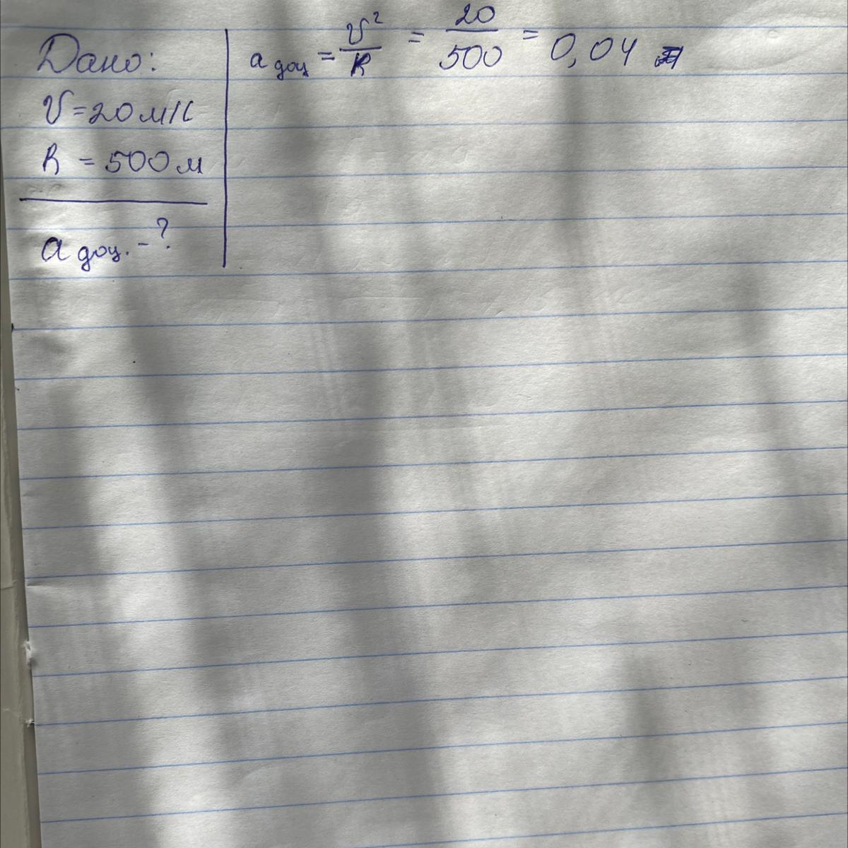 автомобіль рухається зі швидкістю 20 м/с по заокругленню дороги радіус якого 500м . Визначити доцентрове прискорення автомобіля