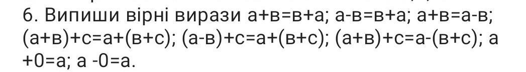 6. Випиши вiрнi вирази а+B=B+a; a-B=B+a; a+b=a-B; (a-B)+c=a+(B+c); (a+b)+c=a-(B+c); a (a+B)+c=a+(B+c); +0=a; a -0=a.