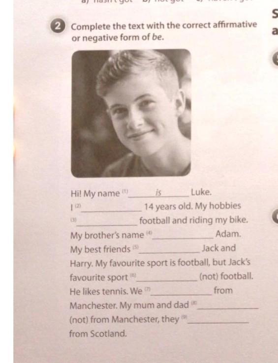 Hi! My name is Luke. I'm 14 years old. My hobbies are football and riding my bike. My brother's name is Adam. My best friends are Harry and Jack. My favorite sport is football, but Jack's favorite sport is not football; he likes tennis. We live in Manchester. My mum and dad are not from Manchester; they are from Scotland.