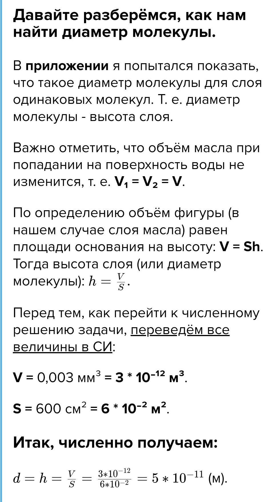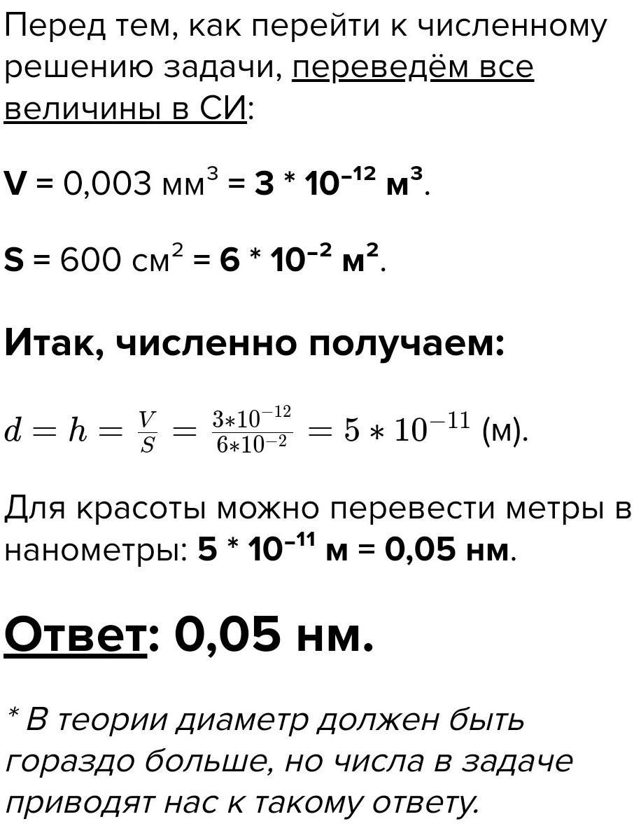 ‼️Запитання.‼️ Краплина олії, об'єм якої 12 мм3, розпливається на поверхні води плямою площею 6000 000 см². Визначте діаметр молекул, якщо припустити, що він дорівнює товщині плями.