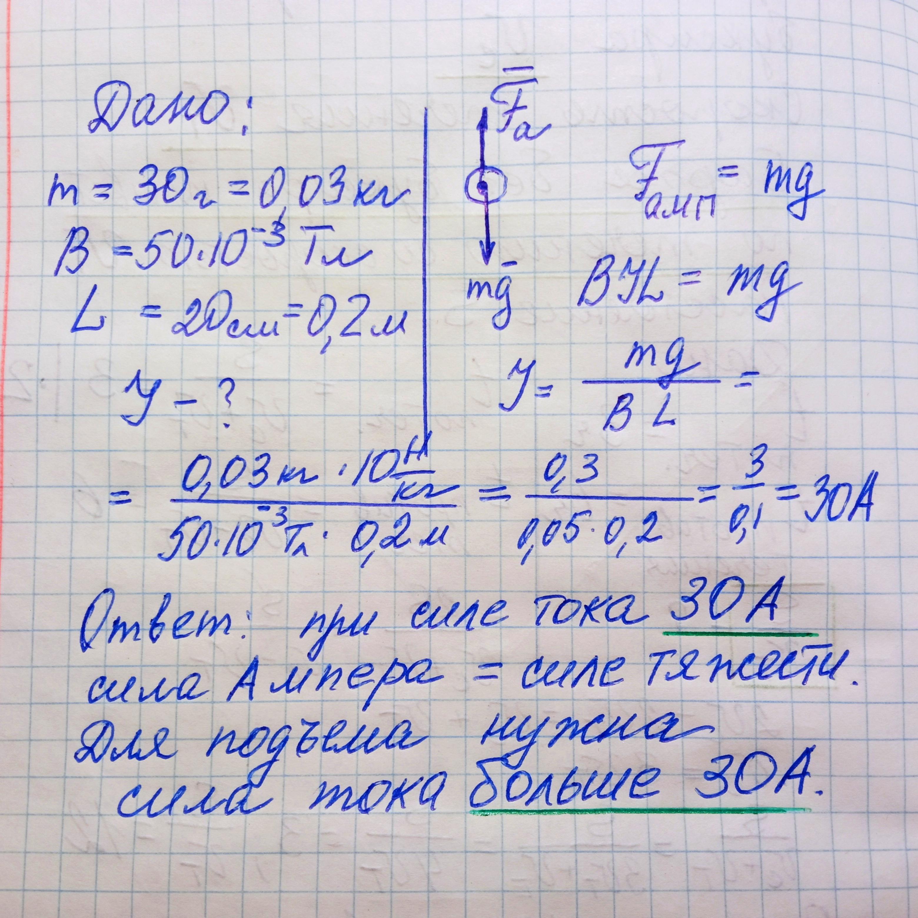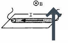 На поверхні столу знаходиться провідник масою 30 г, паралельно поверхні створено однорідне магнітне поле з індукцією 50 мТл, що має напрямок як показано на рисунку. Довжина провідника 20 см. Якої сили струм треба пропустити по провіднику, щоб він почав підніматися над поверхнею столу?