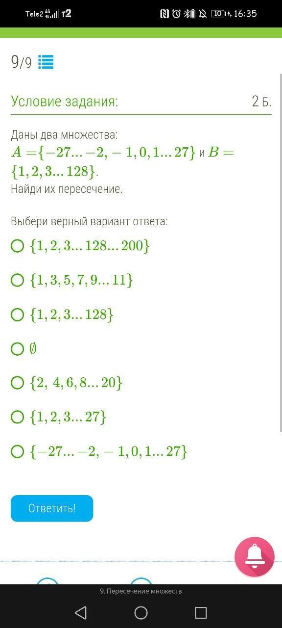 У нас даны два множества: A= {-27...-2, -1, 0, 1...27} (все целые числа с -27 до 27) и {1,2,3...128} (все целые числа с 1 до 128). Надо найти те элементы, которые принадлежат одновременно и множеству А, и множеству В.