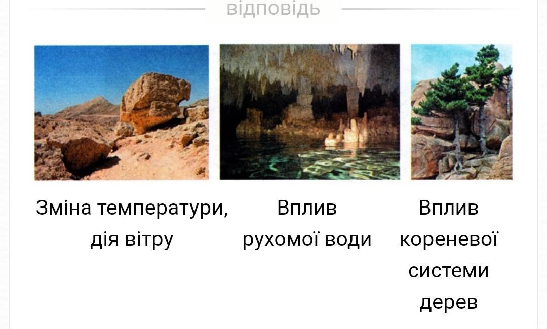 Припусти, які чинники вплинули на руйнування гірських порід, зобра- жених на світлинах. Запиши.
