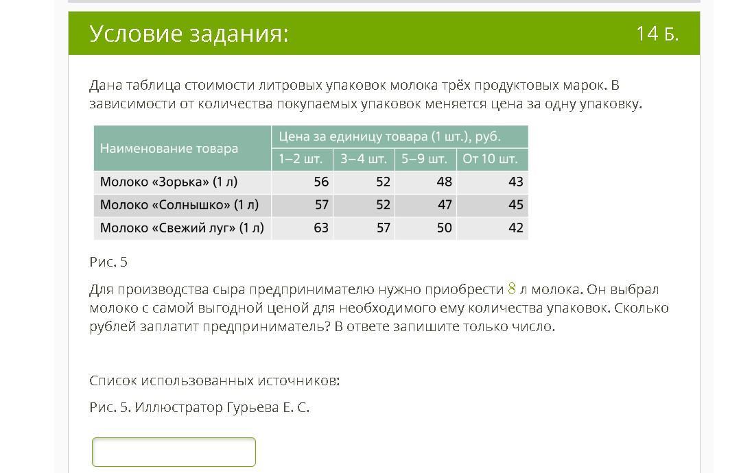 Для приобретения 8 литров молока предпринимателю нужно выбрать молоко с наименьшей ценой за 5-9 штук. Для молока "Свежий луг" это 50 рублей за литр.