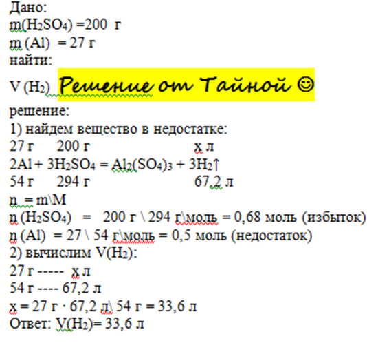 Найти V(Н2) н.у который получается при взаимодействии 27г Al и 200г H2SO4