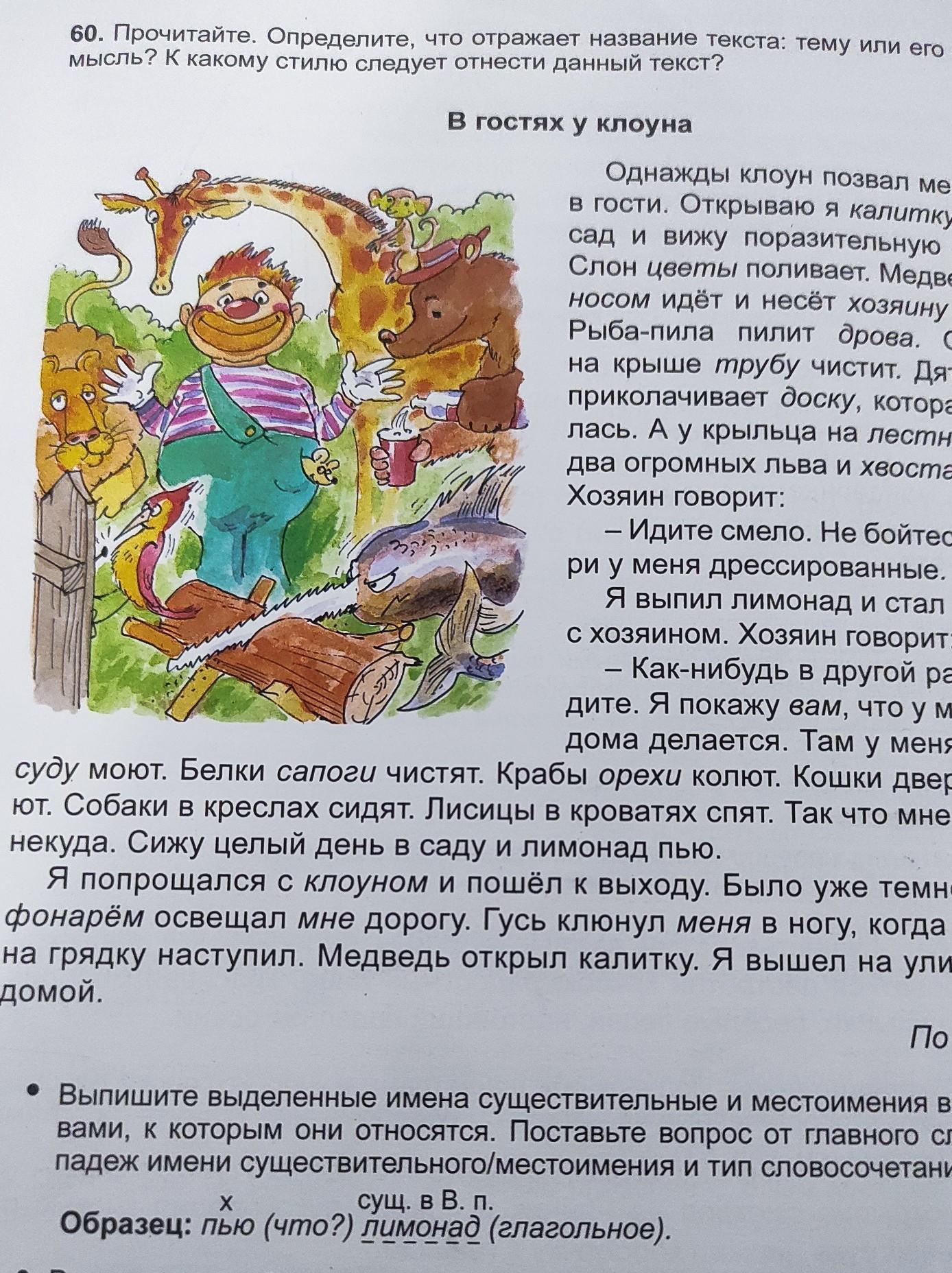 Заголовок "В гостях у клоуна" отражает ТЕМУ текста, ведь в нём нет указания на все происходящие чудеса. Текст относится к ХУДОЖЕСТВЕННОМУ стилю, это сказка.