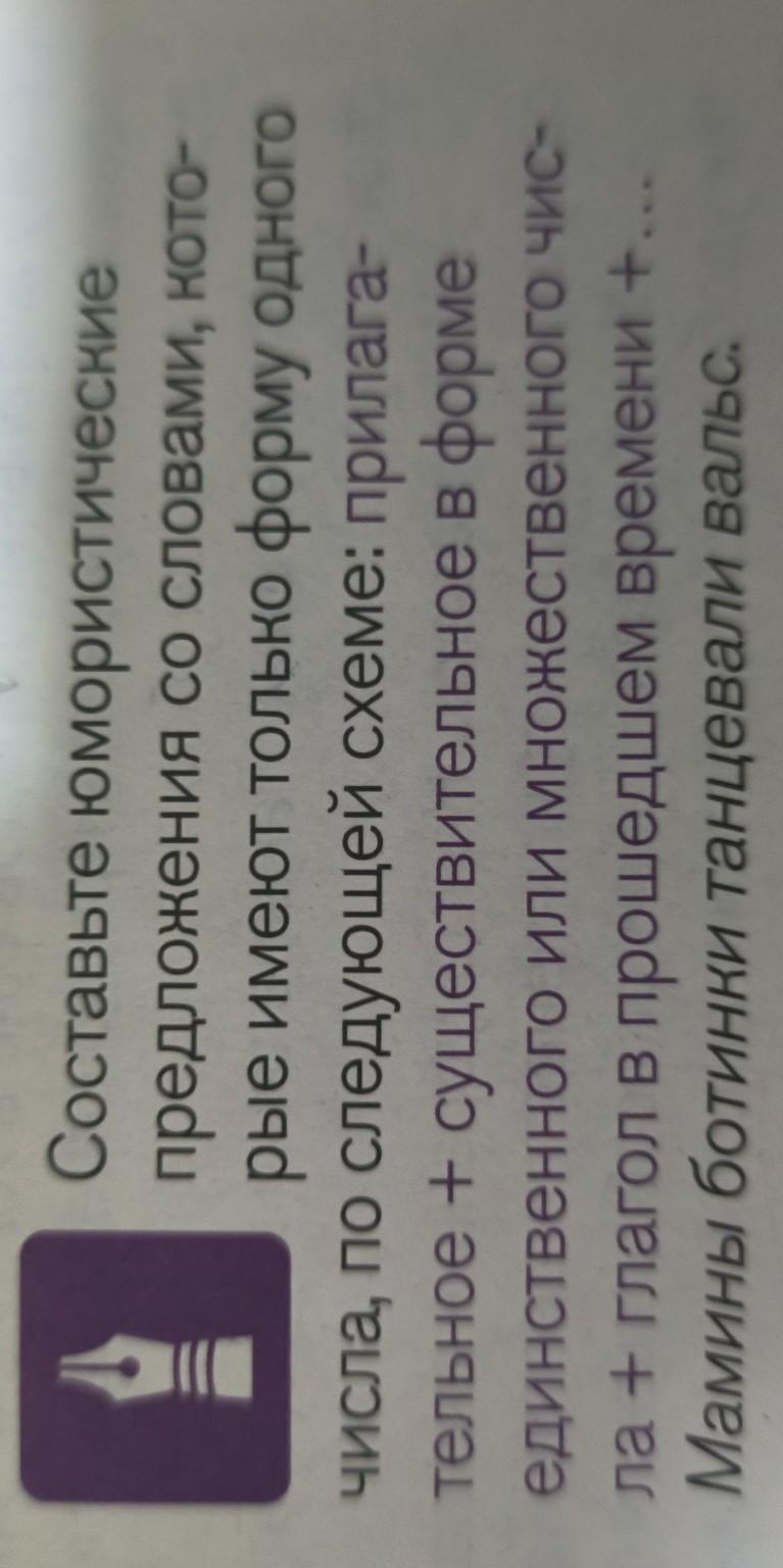 Составьте юмористические предложения со словами, кото- рые имеют только форму одного числа, по следующей схеме: прилага- тельное + существительное в форме единственного или множественного чис- ла + глагол в прошедшем времени +... Мамины ботинки танцевали вальс.