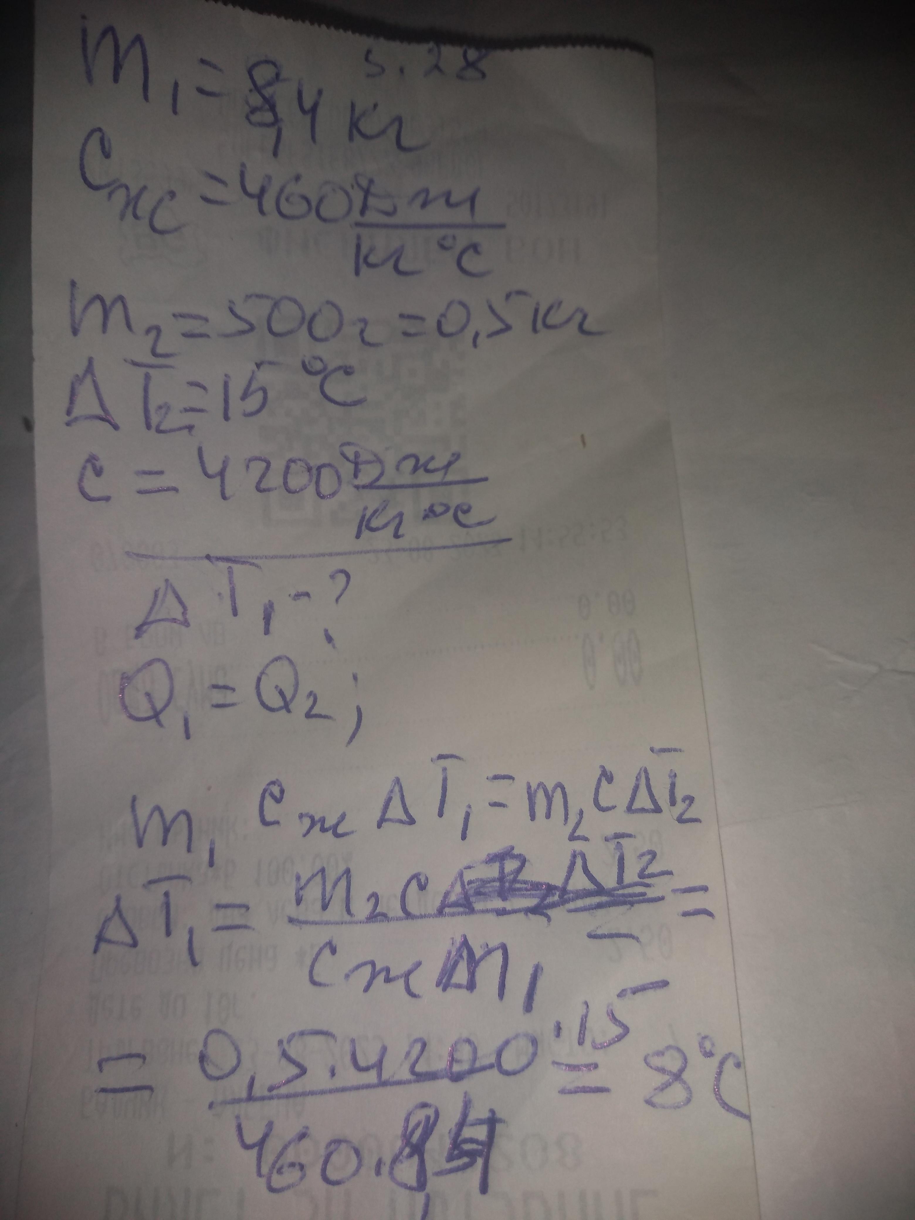 5.28. на скільки градусів підніметься температура сталевої деталі масою 8,4 кг, якщо їй передати таку саму кількість теплоти, що потрібна для нагрівання 500 г води на 15°с?