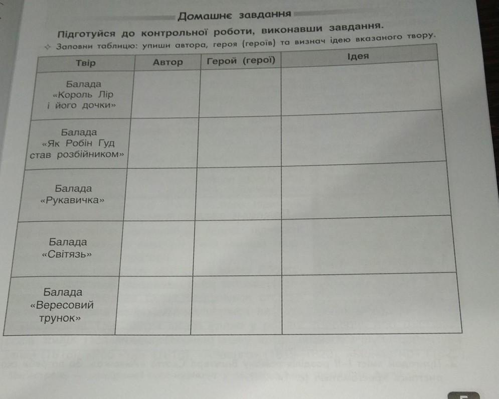 Заповни таблицю: упиши автора, героя (героїв) та визначею вказаного твору. Твір Автор Герой (repoi) Ідея Балада «Король Лір і його дочки» Балада «Як Робін Гуд став розбійником» Балада > Балада > Балада
