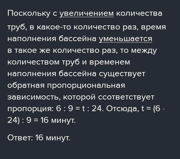С помощью 6 одинаковых труб бассейн заполняется водой за 24 минуты. За сколько минут можно заполнить бассейн с помощью 9 таких клуб