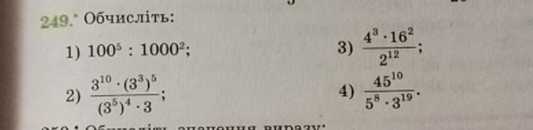 249. Обчисліть: 1) 1005: 1000²; 31⁰ (3³)5. (35) ¹.3 2) 4³.16² 2¹2 45¹0 58.319. 3) 4)