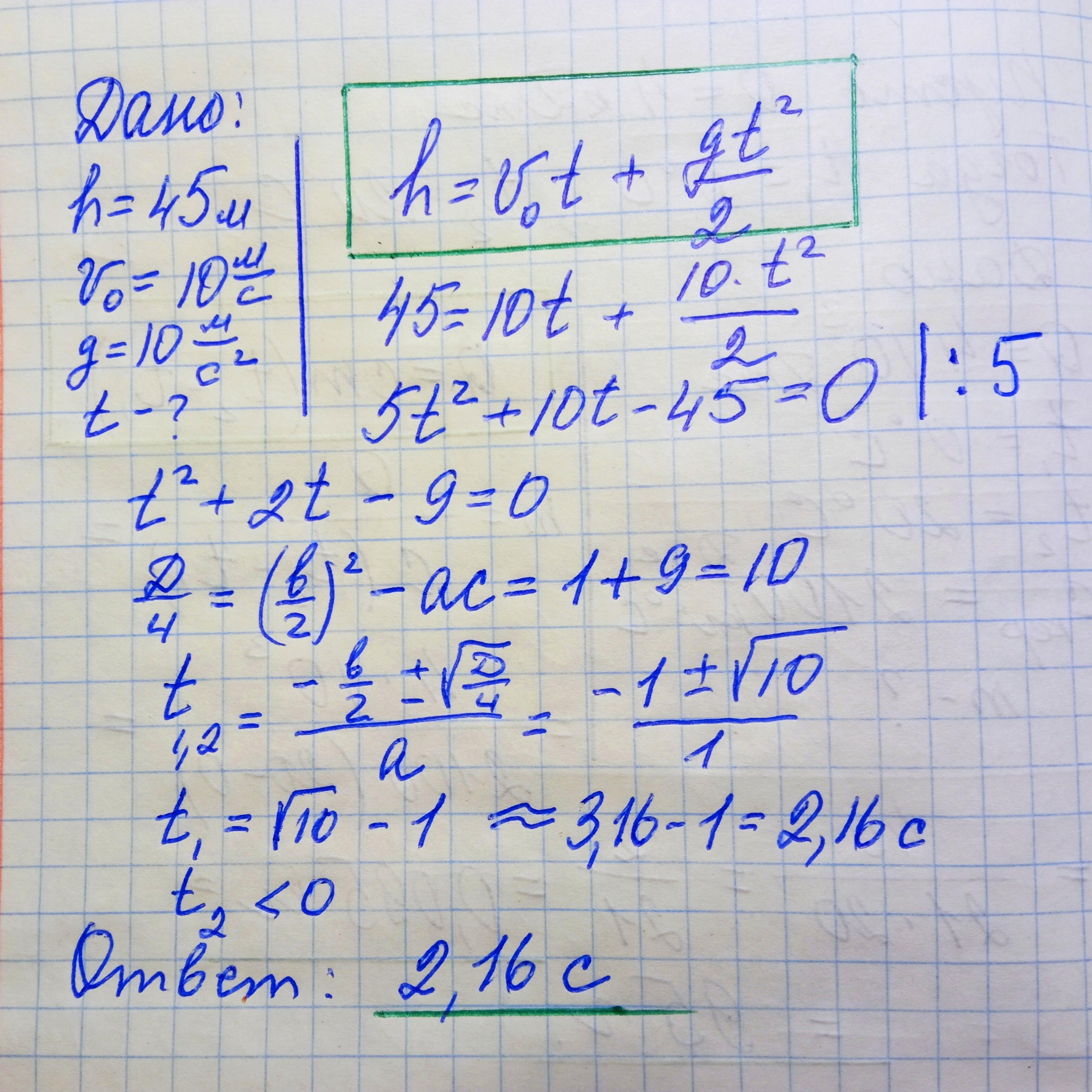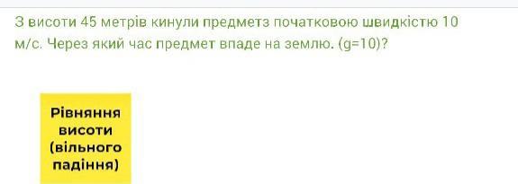 З висоти 45 метрiв кинули предметз початковою швидкістю 10 м/с. Через який час предмет впаде на землю. (g=10)?