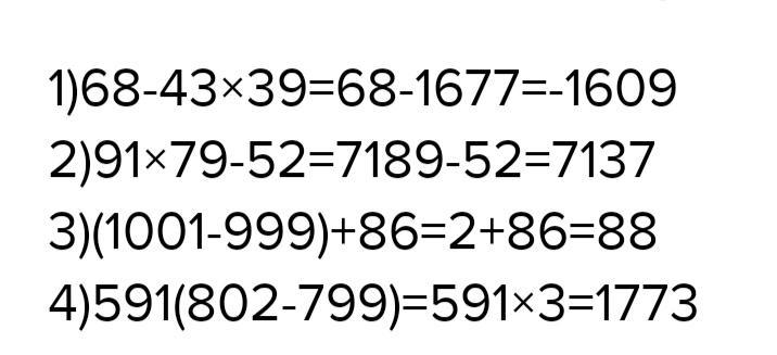 2) 91-79-52²=91-79-2704=-2692 ; 3) (1001-999)+86=2+86=88; 4) 591-(802-799)¹=591-3=588; 1) 68²-43-39= 4624-43-39= 4542