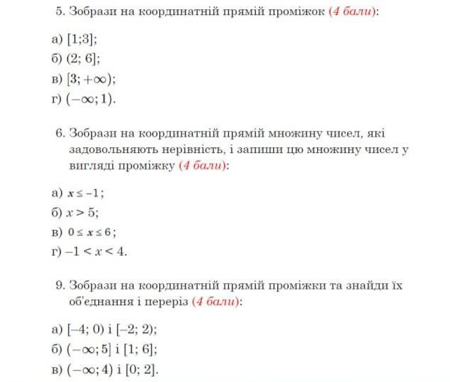 Зобразіть на координатній прямій проміжки та знайдіть їх об'єднання і перетин (4 бали):