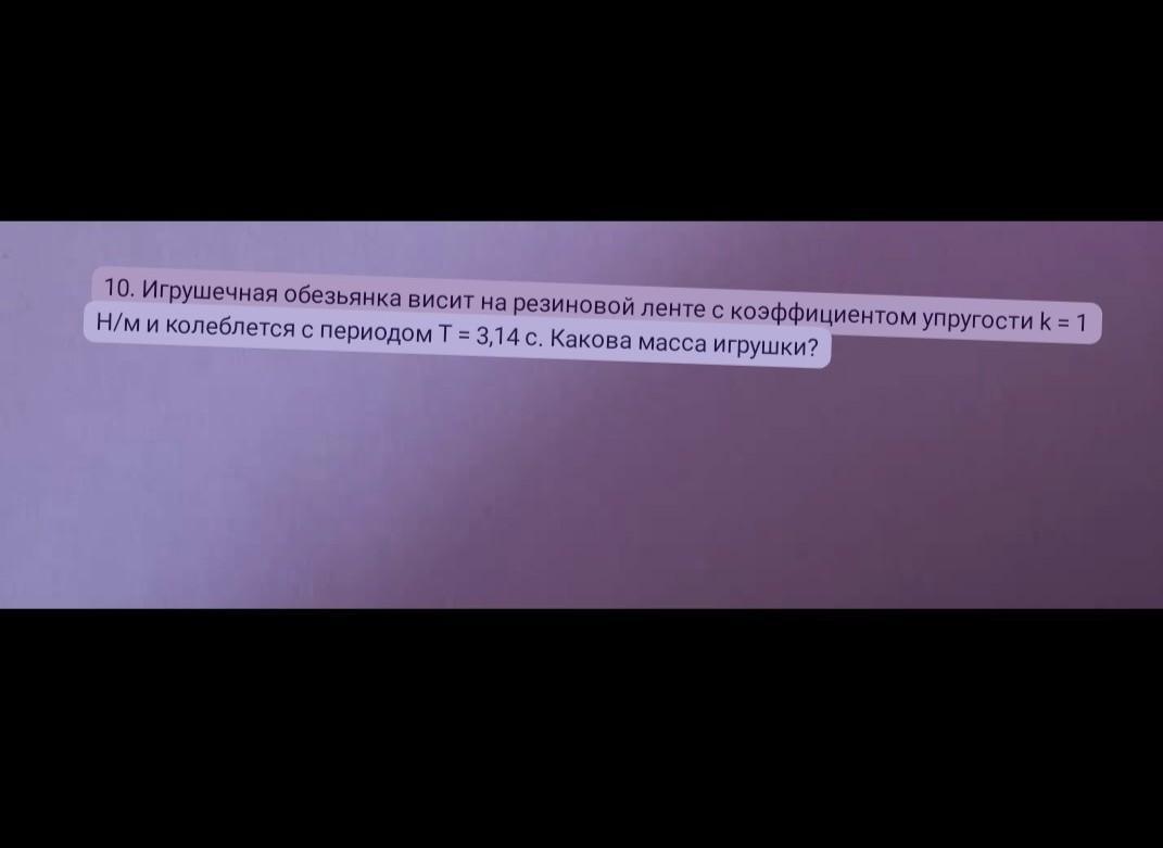10. Игрушечная обезьянка висит на резиновой ленте с коэффициентом упругости к = 1 Н/м и колеблется с периодом Т = 3,14 с. Какова масса игрушки? помогите пж