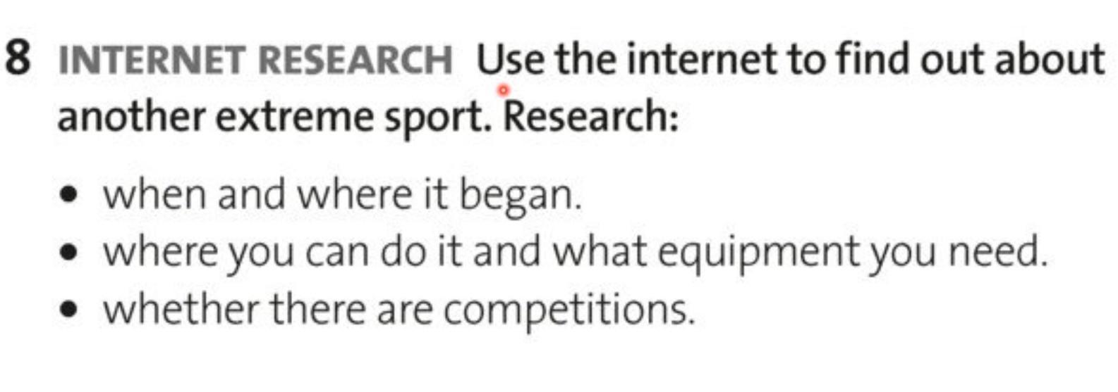 8 INTERNET RESEARCH Use the internet to find out about another extreme sport. Research: • when and where it began. where you can do it and what equipment you need. • whether there are competitions.