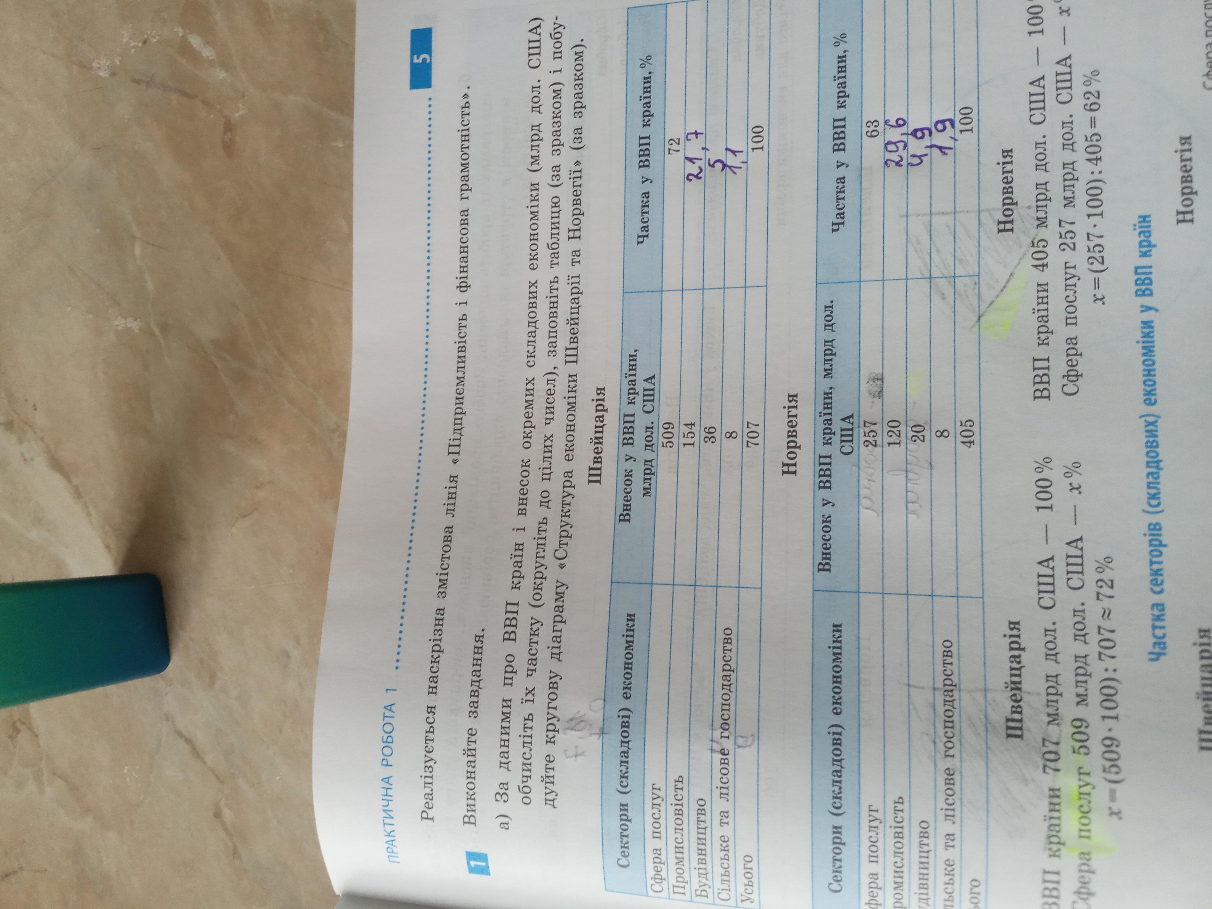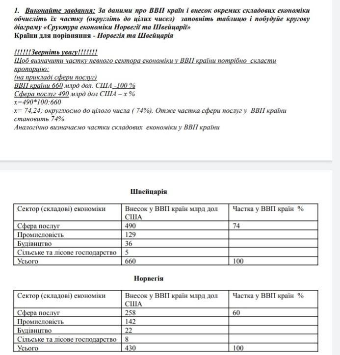 1. Виконайте завдання: За даними про ВВП країн і внесок окремих складових економіки обчисліть їх частку (округліть до цілих чисел) заповніть таблицю і побудуйе кругову діаграму «Сруктура економіки Норвегії та Швейцарії» Країни для порівняння - Норвегія та Швейцарія !!!!!!Зверніть yeazy!!!!!!! Щоб визначити частку певного сектора економіки у ВВП країни потрібно скласти пропорцію: (на прикладі сфери послуг) ВВП краïни 660 млрд дол. США -100% Сфера послуг 490 млрд дол США-x% x=490*100:660 x=74,24; округлюємо до цілого числа (74%). Отже частка сфери послуг у ВВП країни становить 74% Аналогічно визначаємо частки складових економіки у ВВП країни Швейцарія Сектор (складові) економіки Внесок у ВВП країн млрд дол США 490 129 Сфера послуг Промисловість Будiвнцтво Сільське та лісове господарство | 5 Усього 36 660 Сектор (складовi) економіки Сфера послуг Промисловість Будiвнцтво Сільське та лісове господарство Усього Норвегiя Внесок у ВВП країн млрд дол США 258 142 22 8 430 Частка у ВВП краïн % 74 100 Частка у ВВП країн % 60 100