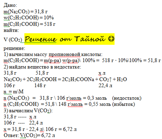 Какой объем газа образуется при добавлении 31,8 г. карбоната натрия к 518 г. 10% раствора пропионовой кислоты?