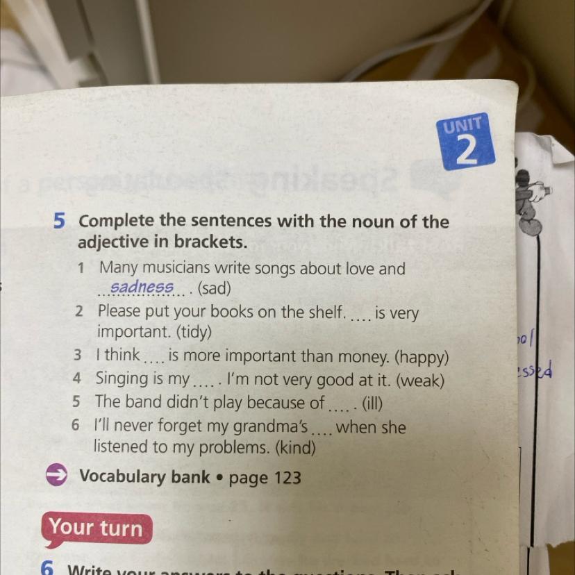 Відповідь: 2)tidness, 3)happiness, 4)weakness, 5)illness, 6)kindness
