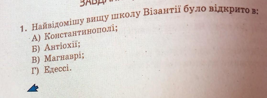 Найвідомішу вищу школу Візантії було відкрито в: A) Константинополі; Б) Антіохії; B) Магнаврі; Г) Едессі.