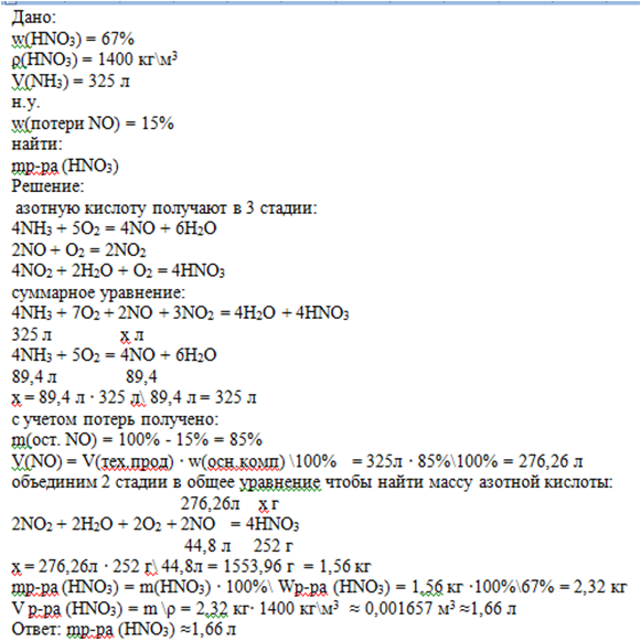 Сколько литров раствора с массовой долей HNO3 67% и плотностью 1400 кг/м3 может быть получено из 325 л NH3(н.у.),если при производстве теряется 15% оксида азота(II)?