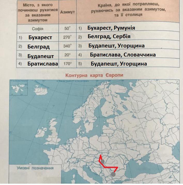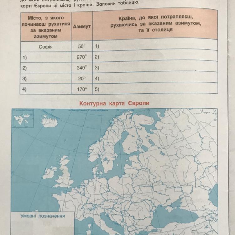 Послуговуючись політичною карту Європи, у кажи столиці країн, до яких потрапляєш, рухаючись за поданим азимутом. Познач на контурній карті Європи цінностей країни. Заповни таблицю. Помогите пожалуйста!!