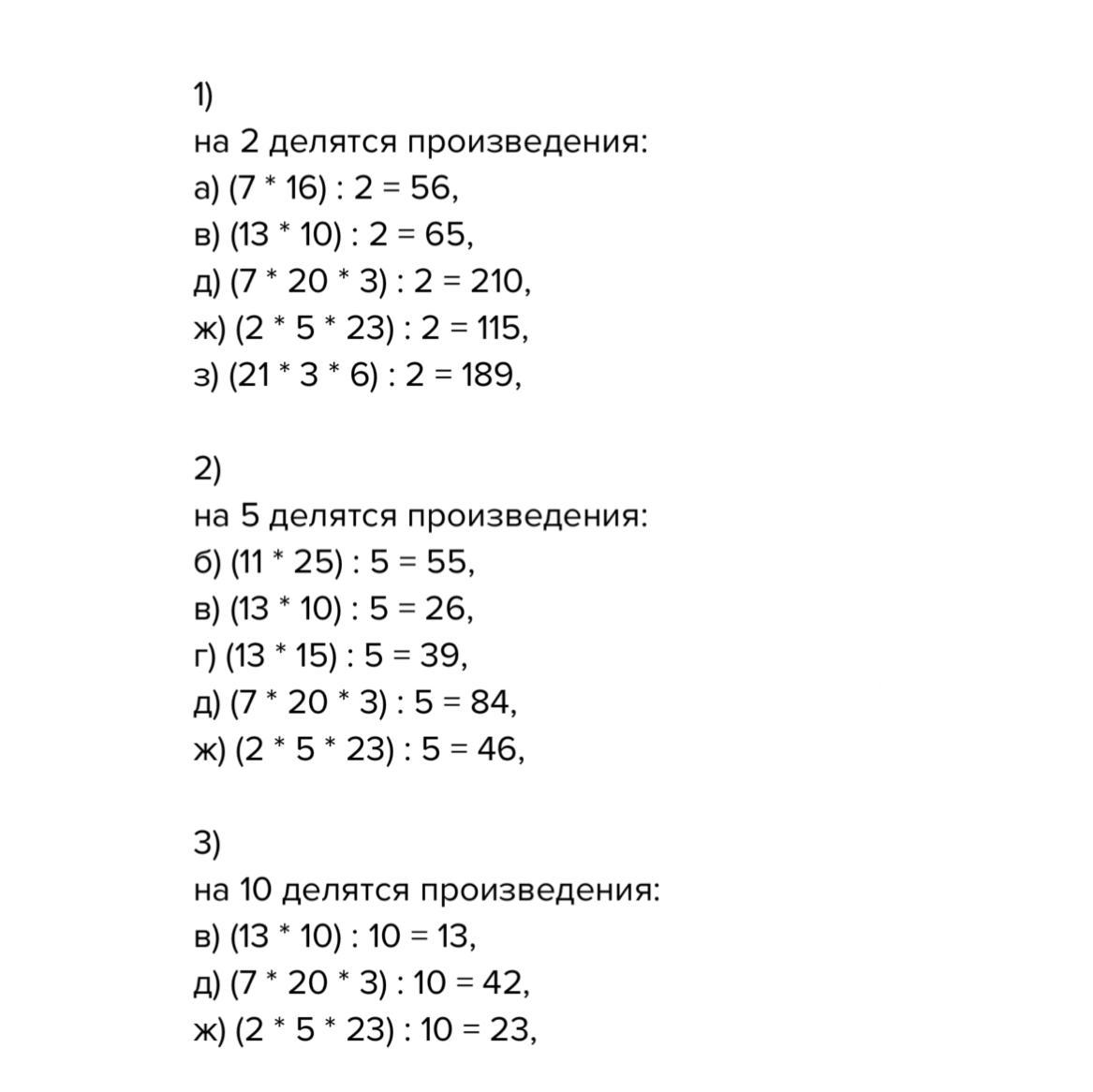 221. По записи числа выберите произведения, значения которых Делятся: 1) на 2; 2) на 5; 3) на 10. a) 7 : 16: B) 13 - 10; 6) 11 . 25; r) 13-15; Найдите значение частного. A) 7-20-3; e) 19-11-13; ж) 2. 5. 23: 3) 21 8 6. 4.