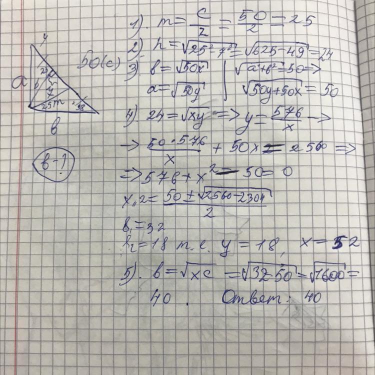 Гіпотенуза прямокутного трикутника 50 см. СМ медіана ,CH-висота проведені з вершини прямого кута. СМ =7 см. Зн:більший катет