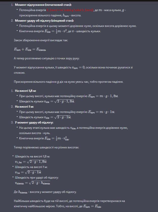 Металеву кульку підняли на висоту 1,8 м над підлогою і відпустили. На якій висоті прискорення вільного падіння кульки буде найбільшим: а) на висоті 1,8 м; б) на висоті 1 м; в) у момент удару об підлогу? На якій висоті із зазначених буде найбільшою швидкість руху кульки? Визначте цю швидкість.