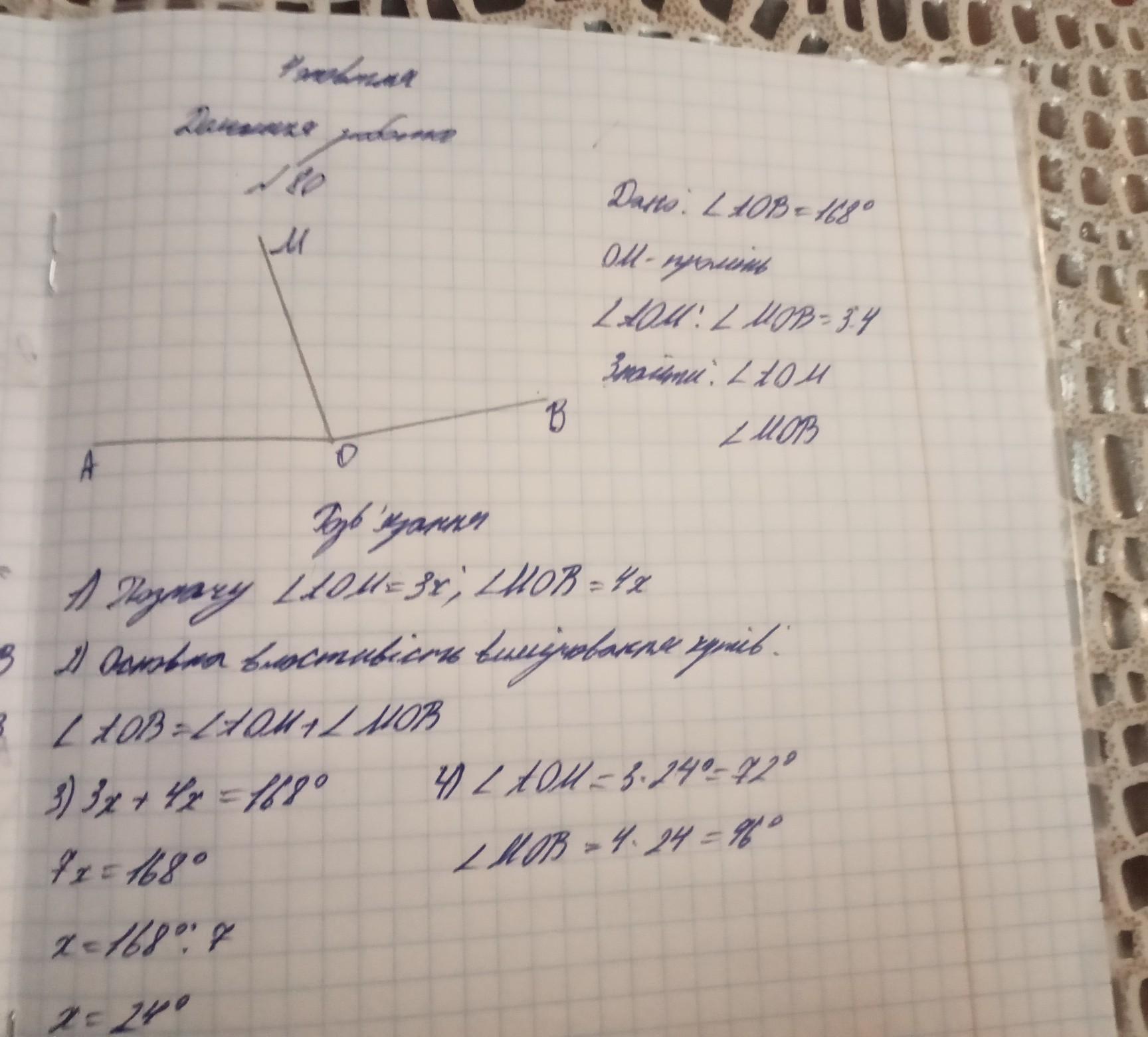 AOB = 168°, промінь ОМ проходить між його сторонами. _ AOM : /_ МОВ = 3 : 4. Знайдіть ці кути. Срочно, даю 41 бал