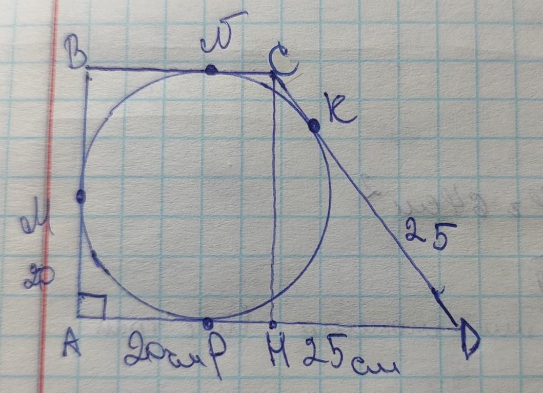 Точка дотику кола, вписаного в прямокутну трапецію, ділить її більшу основу відрізки 20 см і 25 см. Знайдіть площу трапеції.