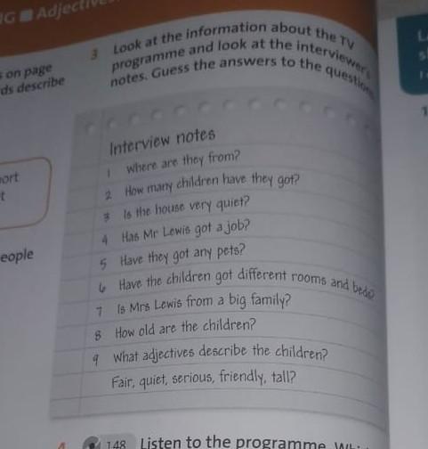 Interview notes where are they from? 2 How many children have they mdly fair short y old quiet got? Is the house very quiet? They've got tharte children Question Has Mr Lewis got a job? Have they got any pets? each of the people Have the children got different rooms and be 7ls Mrs Lewis from a big family? How old are the children? 4 what adjectives describe the children? ple k Fair, quiet, serious, friendly, tall? Помогите пожалуйста Срочно