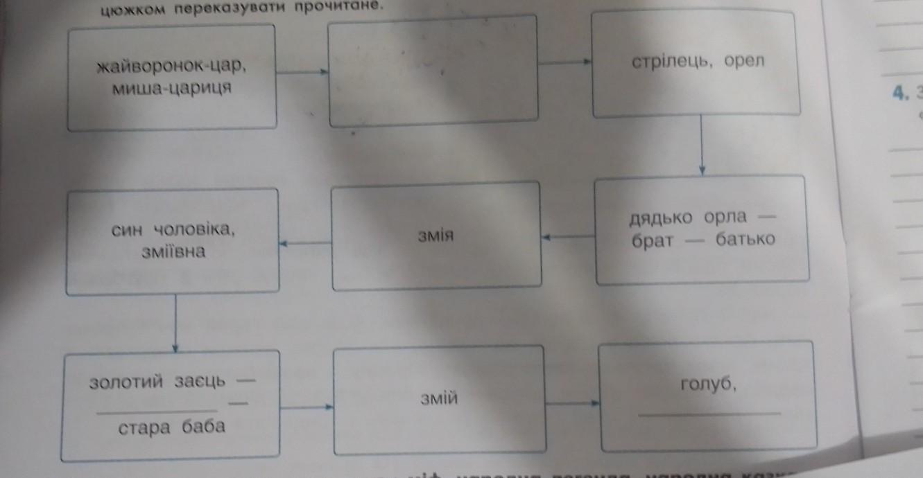 1. Прочитай казку «Яйце-райце» (хрестоматія, ч. 1, с. 16-23). Доповни комiрки, указаючи персонажів послідовно за їхньою появою у творі. Потренуйся цюжком переказувати прочитане.