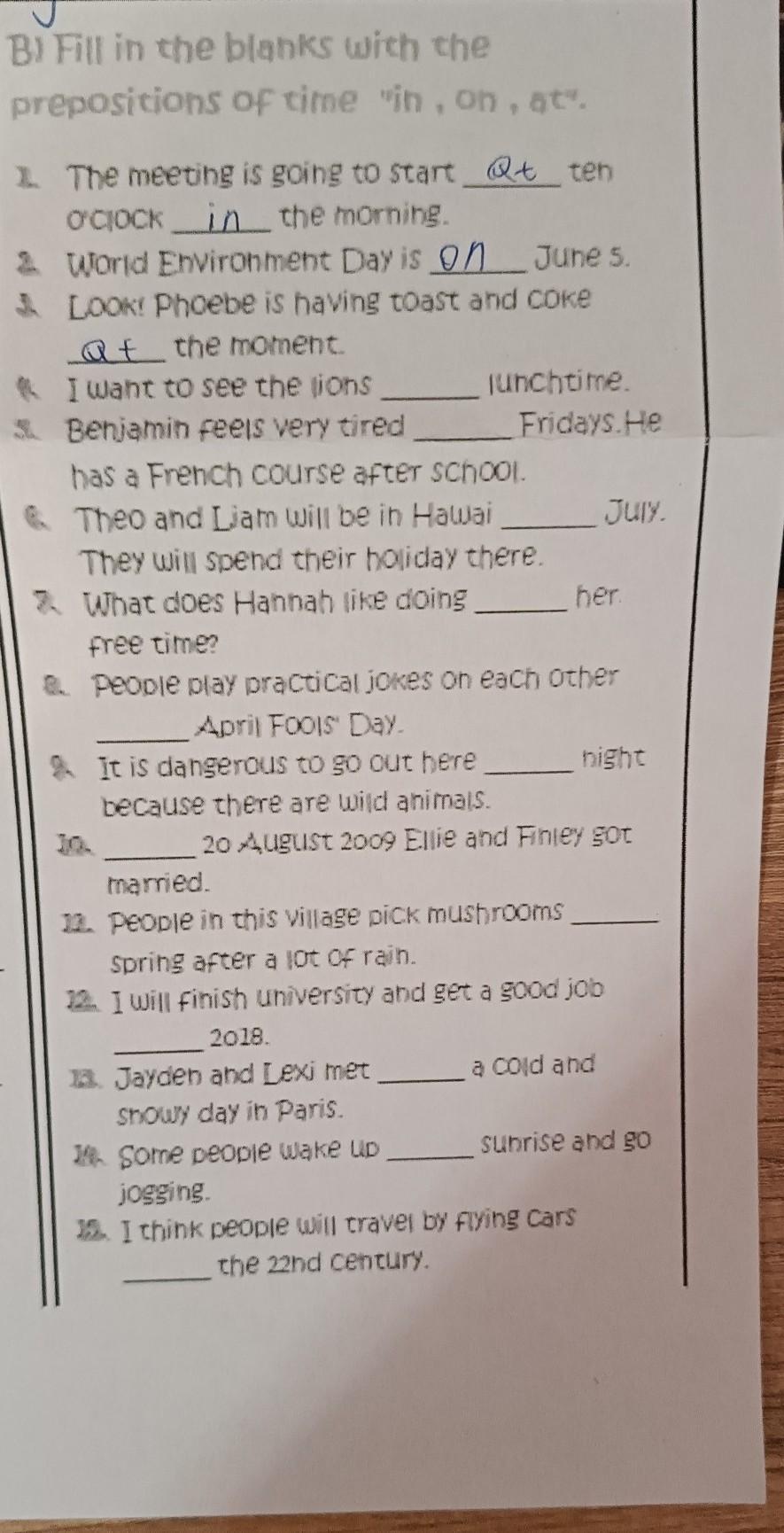 B) Fill in the blanks with the prepositions of time "in, on, at". 1 The meeting is going to start _ ten O'Clock in the morning. World Environment Day is On June 5. LOOK! Phoebe is having toast and coke at the moment. I want to see the lions S. Benjamin feels very tired_ junchtime. Fridays. He has a French course after school. Theo and Liam will be in Hawai They will spend their holiday there. 2. What does Hannah like doing_____________ her. free time? People play practical jokes on each other April Fools Day. It is dangerous to go out here because there are wild animals. July. night 20 August 2009 Ellie and Finley got married. 12. People in this village pick mushrooms Spring after a lot of rain. 12. I will finish university and get a good job 2018. 13. Jayden and Lexi met a cold and