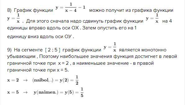 9) На сегменте [ 2 ; 5 ] график функции является монотонно убывающим , Поэтому наибольшее значения функция достигнет в левой граничной точке при х = 2 , а наименьшее значение - в правой граничной точке при х = 5.