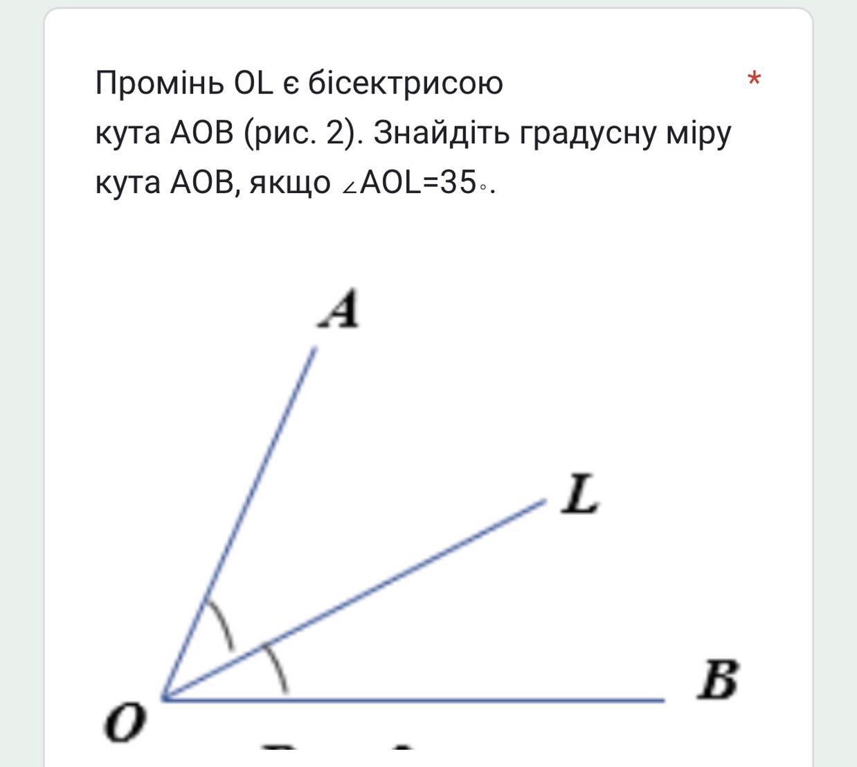 Промінь ОL є бісектрисою кута AOB. Знайдіть градусну міру кута АОВ, якщо кута АOL=35 градусів