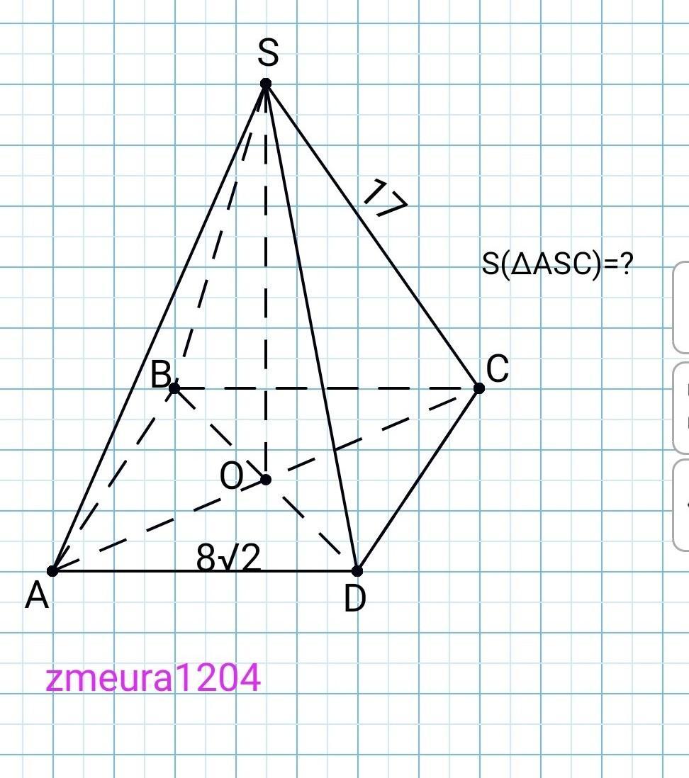 Знайдіть площу діагонального перерізу правильної чотирикутної піраміди якщо сторона основи дорівнює 8√2 см, а бічне ребро- 17 см.