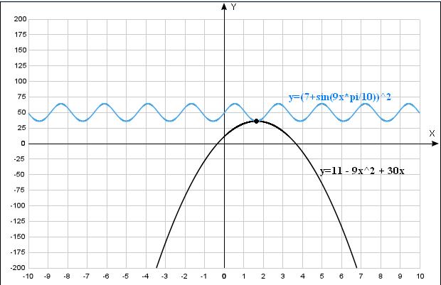 Пересекаются графики в вершине параболы, т.е. x0 = 30/18 = 5/3.