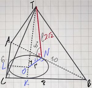 Опустим высоты боковых граней TK, TL, TN и высоту пирамиды TO.