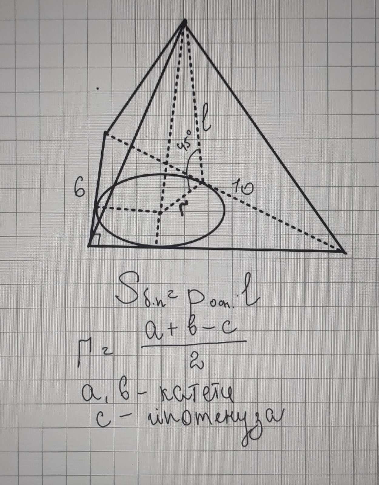 Допоможіть благаю!!! основою піраміди є прямокутний трикутник з катетами 6 см і гіпотинузою 10 см. Усі бічні грані піраміди утворюють з площиною основи кути по 45° . Знайдіть площу бічної поверхні піраміди