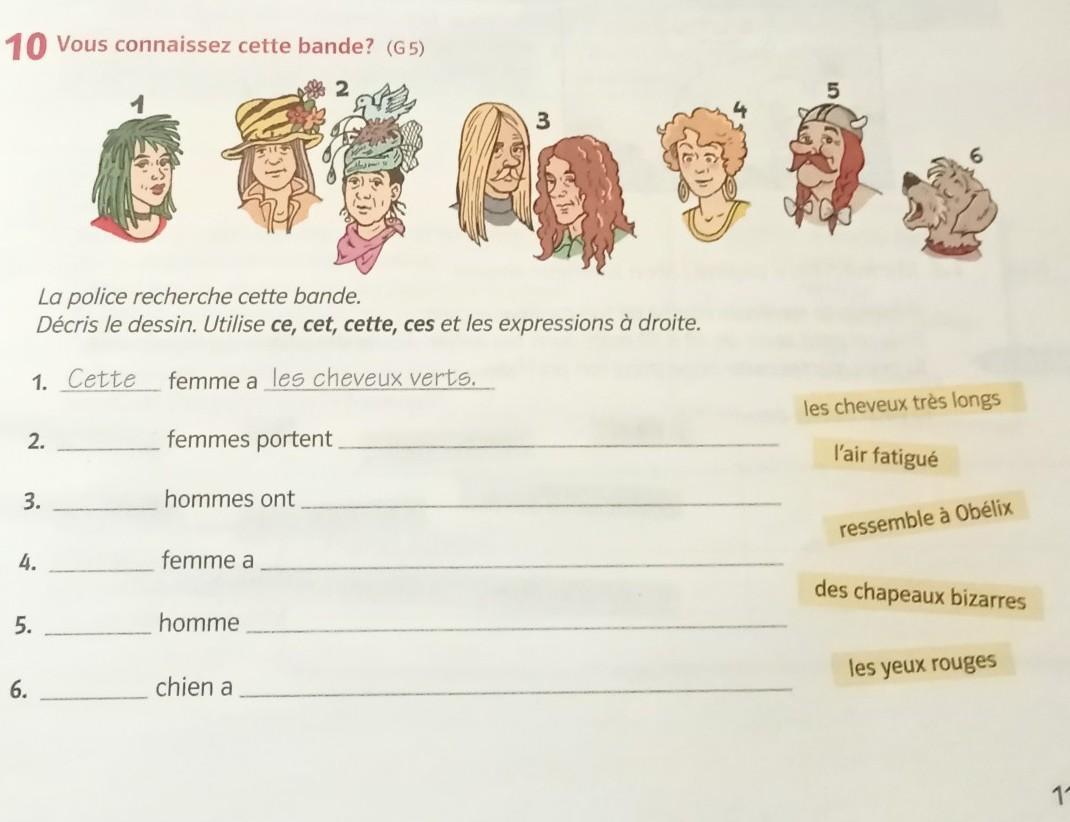 10 Vous connaissez cette bande?(G5) 2. La police recherche cette bande. Décris le dessin. Utilise ce, cet, cette, ces et les expressionsàdroite. 1. Cette femme a les cheveux verts. femmes portent 3. 4. 5. 6. 3 cfp50g hommes ont femme a homme chien a les cheveux très longs l'air fatigué ressemble à Obélix des chapeaux bizarres les yeux rouges