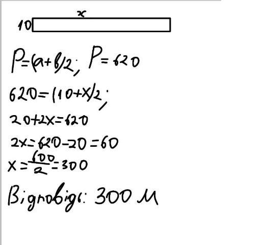 Периметр злітно-посадкової смуги для літаків становить 620м. Ширина смуги- 10 м. Яка її довжина?