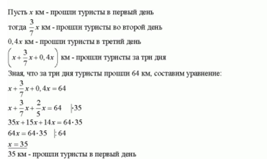 31. За три дні турист пройшов 64 км, причому за другий день він пройшов 3/7 відстані, пройденої за перший день, а за третій — 40% відстані, пройденої за перший день. Скільки кілометрів проходив турист кожного дня?