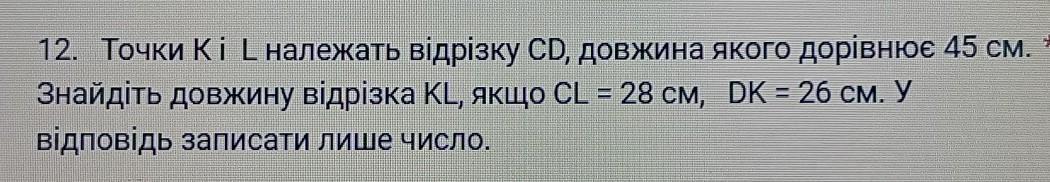 Точки К i L належать відрізку CD, довжина якого дорівнює 45 см. Знайдіть довжину відрізка КL, якщо CL = 28 см, DK = 26 см. ЦЕ ДУЖЕ СРОЧНО! ЦЕ КОНТРОЛЬНА РОБОТА