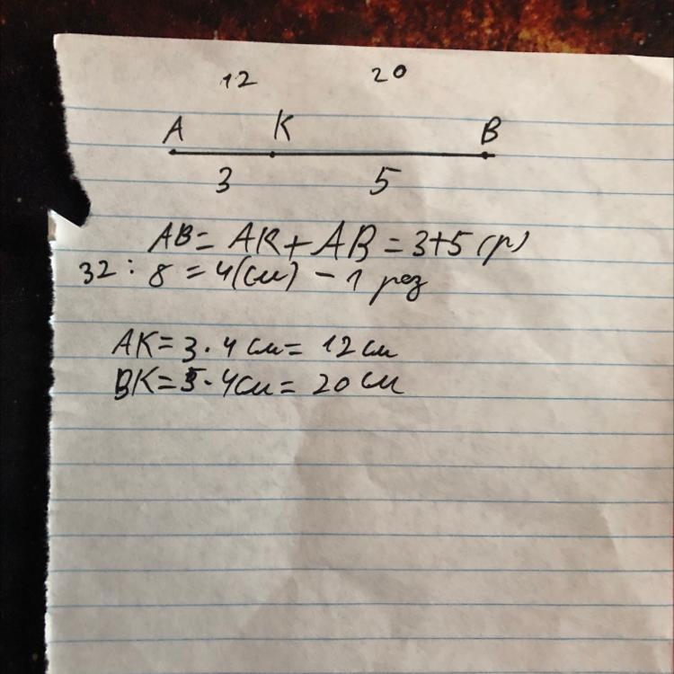 На відрізку AB завдовжки 32 см позначено точку К. Знайдіть довжини відрізків АК і ВК, якщо АК : ВК = 3 : 5.