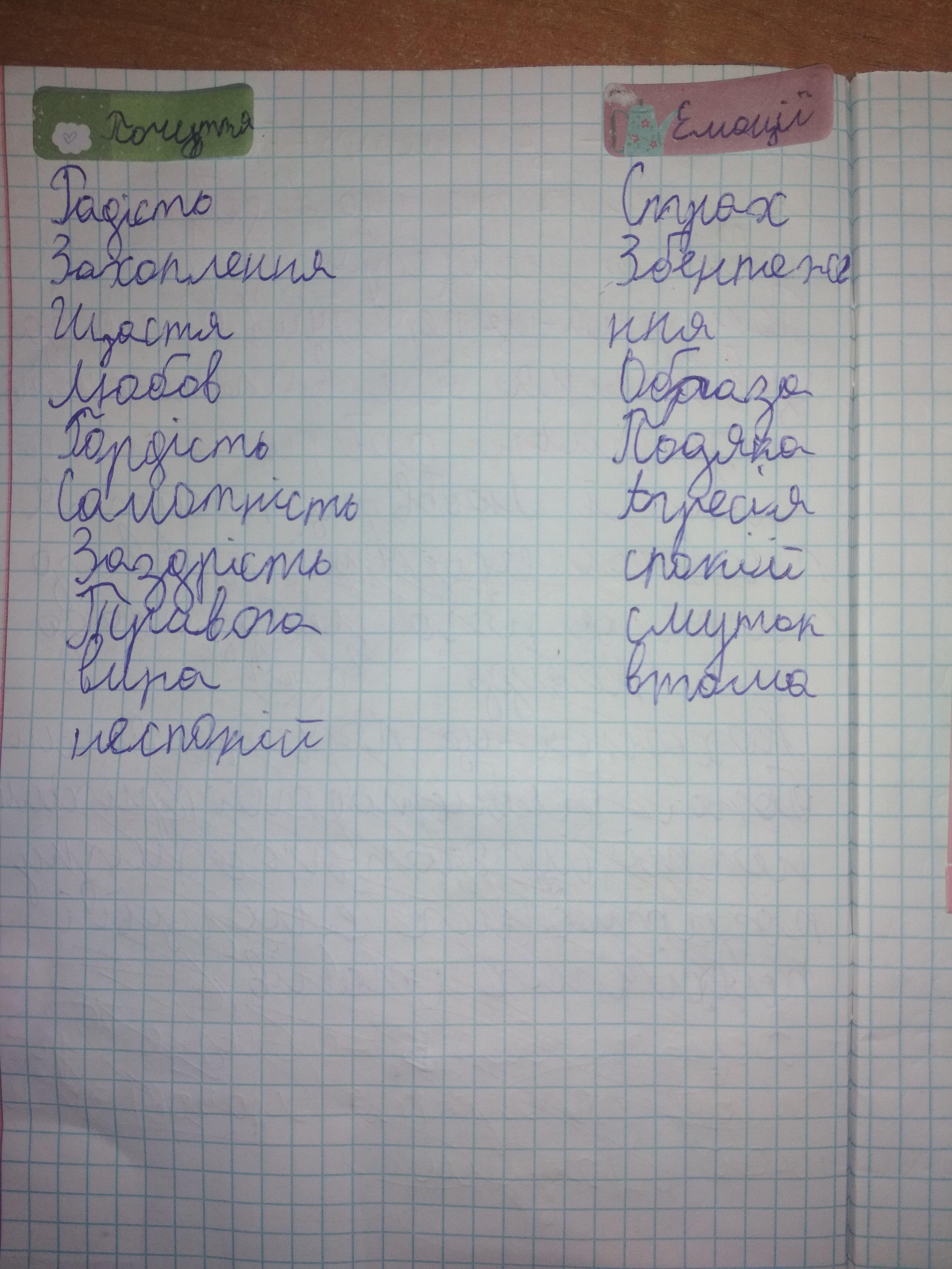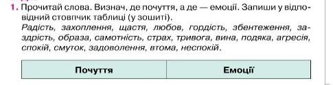 Прочитай слова. Визнач, де почуття, а де емоції. Запиши у відпо- відний стовпчик таблиці (у зошиті). Радість, захоплення, щастя, любов, гордість, збентеження, за- здрість, образа, самотність, страх, тривога, вина, подяка, агресія, спокій, смуток, задоволення, втома, неспокій. Почуття Емоції СРОЧНО ДАМ 100 БАЛОВ
