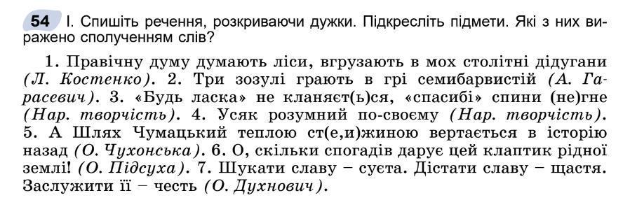 Допоможіть будь ласка. Із вправи 54 випишіть тільки ті речення, підмет у яких виражено словосполученням.