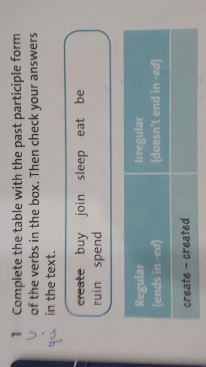 1 Complete the table with the past participle form of the verbs in the box. Then check your answers in the text. create buy join sleep eat be ruin spend Regular IrreguIar