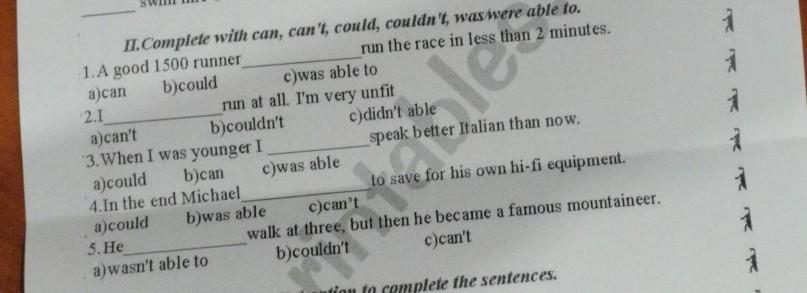 II. Complete with can, can't, could, couldn't, was were able to. run the race in less than 2 minutes. 1. A good 1500 runner_ a)can b)could c)was able to 2.I run at all. I'm very unfit b)couldn't a)can't 3. When I was younger I a)could b)can 4. In the end Michael a)could 5. He a) wasn't able to c)was able b)was able c)didn't able speak better Italian than now. to save for his own hi-fi equipment. c)can't walk at three, but then he became a famous mountaineer. b)couldn't c)can't