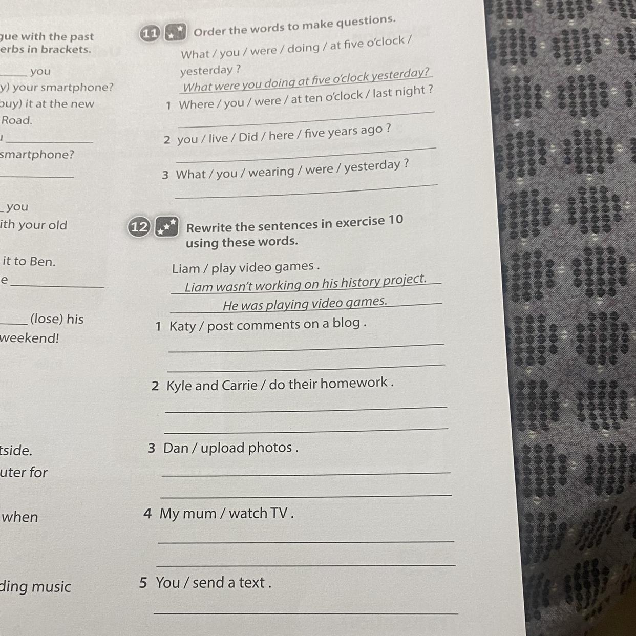 N11 1)where were you at ten o'clock last night. 2)did you live here five years ago 3)what were you wearing yesterday N12 1)katy wasn't studying. She was posting comments on a blog. 2)Kyle and Carrie weren't playing video games. They were doing their homework 3)Dan wasn't watching videos. He was uploading photos 4)My mum wasn't playing video games. She was watching TV. 5) You weren't doing homework. You were sending a text